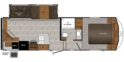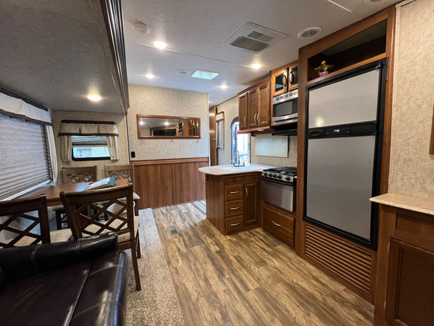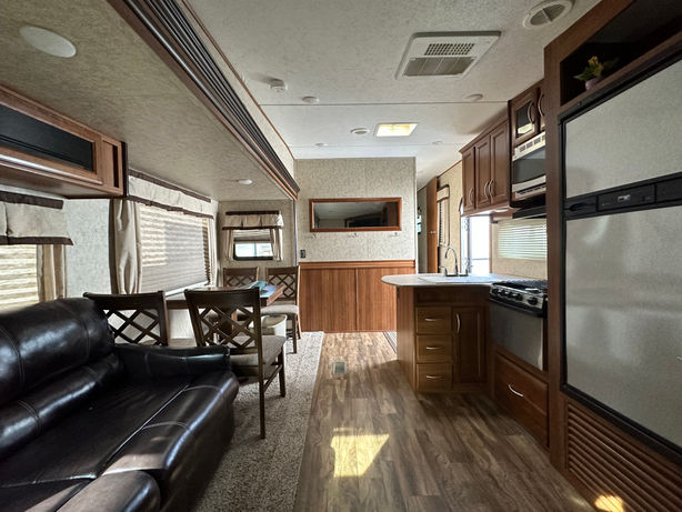 * HOME LIKE * Large Entertainment center in corner * 1 slide Out * Queen Bed * L Style Kitchen * 29' in length * Sleeps 4 people * table & Chairs * Tri Fold Couch Sofa bed OUTDOOR KITCHEN * 7282 WEIGHT , Don't Miss this One